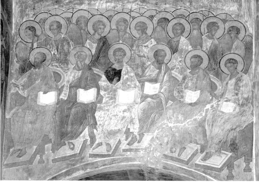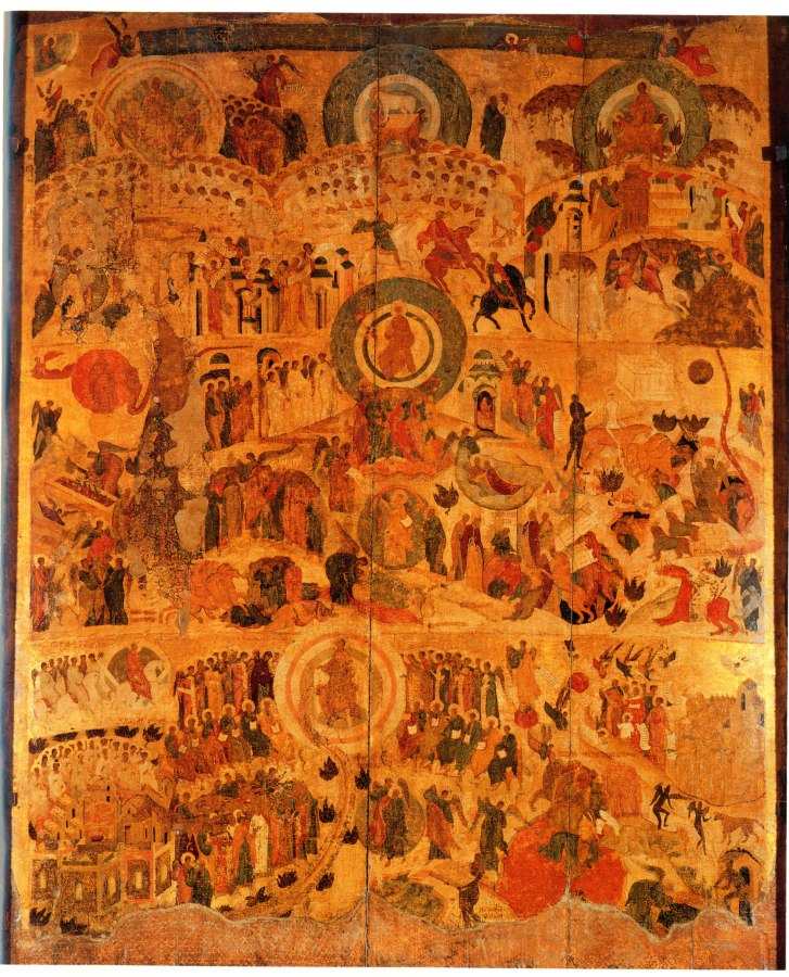 This circumstance was noticed by specialists in ecclesiastical history a long time ago: “Expectations of the Apocalypse in Russia were different from the intimation of an imminent global cataclysm typical for the West around 1000 or 1500. Orthodox eschatology was coloured in solemn and enlightened hues, the present and the future, as well as heaven and earth, were perceived as one” ([577:1], page 5). Also: “The expectations of doomsday and the second coming became reflected in the ‘Apocalypse’ – the oldest Russian icon known to us that depicts these events. The main motif, which is repeated in the icon several times, is the hosts of the righteous clad in white that sing hosanna to the throne of Lord” ([577:1], pages 11-12).