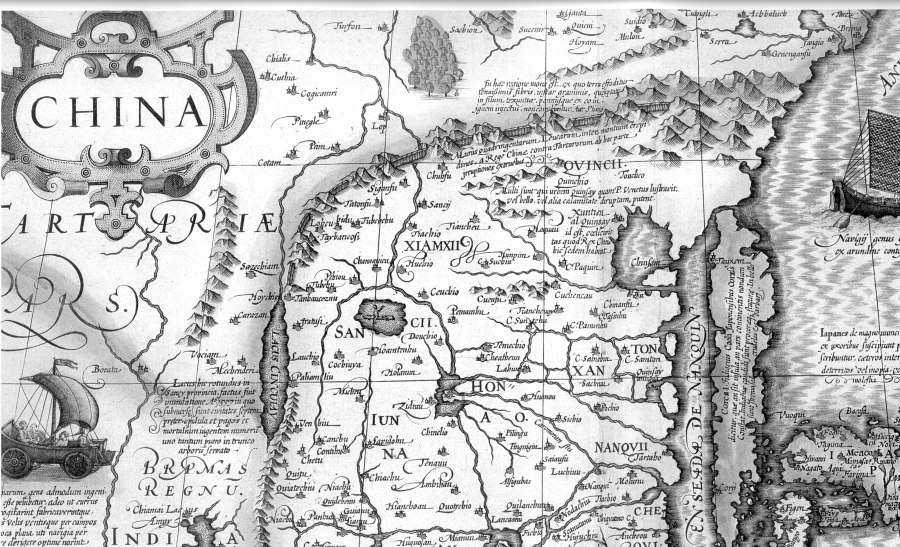 Fig. 5dp-05. Fragment of a map of China allegedly dating from 1619 from the Atlas of Mercator and Hondius. We see the Great Wall of China, which goes right along the border of China as it was in the early XVII century (or even later). This is all the more obvious on the coloured map, where the borders are drawn as yellow and red lines. We see a yellow line and a red line, both of which follow the Great Wall of China. Such disposition of the Great Wall gets a perfect explanation in our reconstruction – the long wall was used to define the state borders in the XVII century, the epoch when the Great = “Mongolian” Empire broke apart. The Dapple Horde, which later became China, proclaimed independence from other parts of the Empire. Also, the Great Wall had never served the purpose of an actual military fortification. See CHRON5, Chapter 6:5.1.