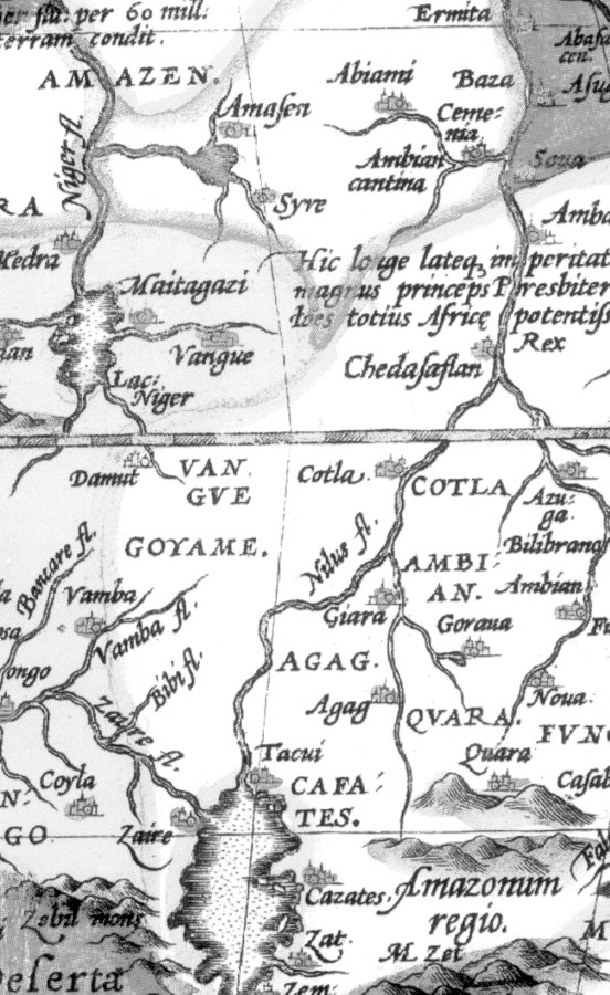 Fig. 5dp-06b. Fragment of an ancient map of Africa compiled by Ortelius in the alleged years 1570-1612. We see a region called “Amasonum Regio” in South Africa (Amazon Kingdom?). There is also the land of Amazen (Amazons?) in Central Africa, north of the Equator. To the north of “Amasonum Regio” we see the land of Agag and the city by the same name, which must be the well familiar name Gog, common in the Horde. Also mark the region of Gaoga in Nubia, qv in the photograph of the whole map. Abraham Ortelius: “Theatrum Orbis Terrarum”. Taken from [1261:1]. See more about the Amazons, or the Cossack women, in CHRON4, Chapter 4:6.