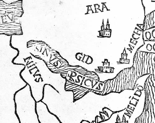 Fig. 5dp-08a. Fragment of an ancient map of Africa and Arabia allegedly dating from 1508 (close-in). We see the name “SINVS RSICVS” applied to the Red Sea. Taken from [1459], Plate XXIV, No. 69. We see a similar name on the map of Ortelius (“Mar Rosso”), and also on a map of 1598. See Abraham Ortelius: “Theatrum Orbis Terrarum” ([1261:1]; also [1459], Plate XLV, No. 166).