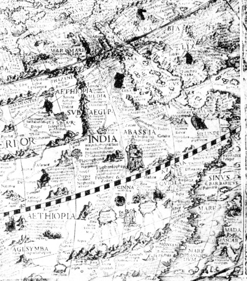 Fig. 5dp-11a. Close-in of a fragment of Caspar Vopell’s map with India at the centre of Africa. The corresponding legend is as follows: “India major . . . Christiani . . .” – apparently, “Greater India, a Christian country”. Unfortunately, we haven’t managed to decipher the rest of the legend due to the low resolution of the photograph. Taken from [1459], Plate XXXIX, No. 111.