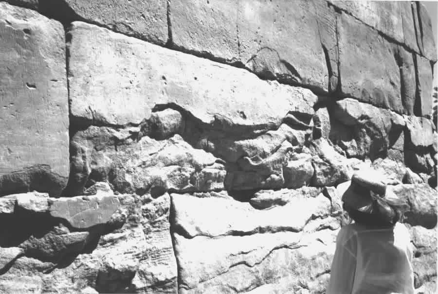Fig. 5dp-13. Stone masonry near the entrance to the Karnak Temple in Egypt. The eroded parts of the huge stone blocks reveal chaotic layer curves. Such amorphous structure of the stone implies that the block didn’t come from a quarry (in which case the layers would be parallel), and can be identified as a concrete casting made in several stages, hence the erratic nature of the layers. Liquid concrete was poured into a mould and hardened portion by portion. Photograph taken in 2000.