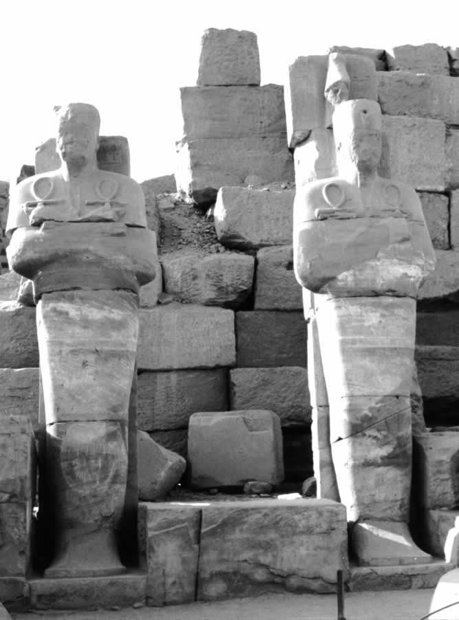 Fig. 5dp-14. Two effigies of the deceased Pharaohs in the Temple of Karnak, Egypt. Both have their arms crossed on their chests, as is customary for Christian burials. Both are holding Coptic Christian crosses with loops at the top, or “ankhs”, in either hand. Photograph taken in 2002.
