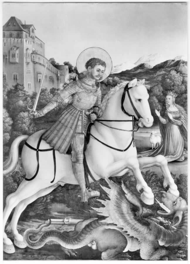 Fig. 5dp-18. “St. George Fighting the Dragon” by Martin Schaffner. Once again we see the saved princess, just like Andromeda in the legends of the “ancient” Perseus. Mark the curly hair of St. George – as we have already pointed out, this detail is very typical for most works of art that portray St. George. See CHRON5, Chapter 12:11.4 for more details. Taken from the following postcard: Augsburg Staatsgalerie. Aufnahme Helga Schmidt-Glassner. Deutscher Kunstverlag, München & Berlin (146).