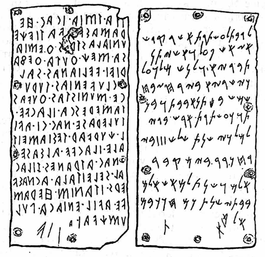 Fig. 5dp-19. “Famous golden tablets from Pyrga with parallel inscriptions in Etruscan and Phoenician. The translators have failed to reach a consensus on this issue”. Taken from “Veneti: Ancestors of the Slavs” by Pavel Tulayev (Moscow, “Byelye Alvy”, 2000), pages 70-71. Already in the XIX century the research of such prominent scientists as A. D. Chertkov and F. Volanski revealed that many Etruscan texts can be deciphered with the aid of Slavic languages. However, no details of such research are ever made public. See more on this subject in CHRON5, Chapter 15.