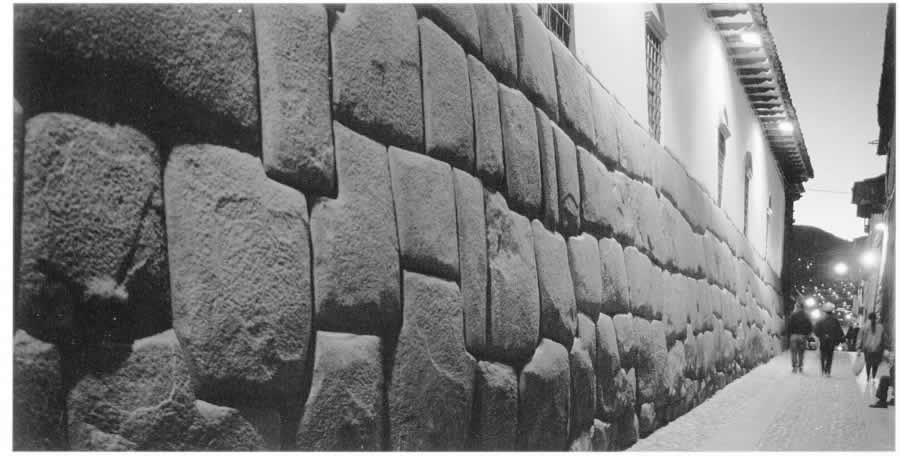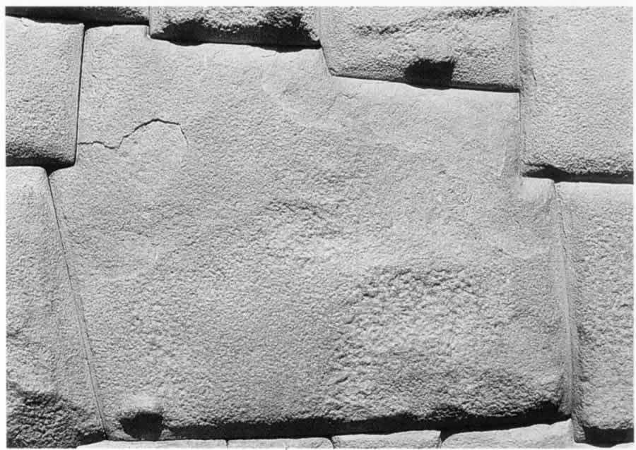 Fig. 5dp-20a. The wall built by the “ancient” Incas in the Peruvian city of Cuzco (Calle Hatunrumiyoq). It is made of large blocks that fit together very tightly – local guides never tire of emphasising that one cannot get so much as a blade of a knife between adjacent blocks. Historians and archaeologists compete in inventing various “theories” of great ingenuity in order to explain how the “ancient” Incas managed to “cut and fit together” enormous stone blocks of immense weight. Even more elaborate theories are constructed to explain how stone blocks of this size could be elevated to the top of the construction. Authoritative sources are trying to convince us that each such block was “the fruit of many months of labour”. However, the new information that we have about construction works in the Middle Ages makes it rather easy to explain all the above. Such walls of Incan cities (and even more monumental ones) were made of concrete blocks. The technology must have been as follows: sacks of rough cloth were filled with liquid concrete and placed inside wooden frames. The sacks assumed the necessary shape, and the concrete clung to the existing blocks, already solid, without any spaces left in between. The external part of the sack would then be removed; smaller pieces of fabric must have disintegrated without affecting the masonry. This theory was voiced by S. M. Bourygin after he became familiar with our conception of the New Chronology and the research of I. Davidovich in the field of geopolymeric concrete (see CHRON5, Chapter 19:6). S. M. Bourygin supplied us with numerous photographs of such walls common for many Peruvian cities. Taken from Alexandra Arellano’s book entitled "All Cuzco. Peru". - Fisa Escudo de Oro. Centre of Regional Studies of the Andes "Bartolome de las Casas", Lima, Peru. Instituto de Investigacion de la Facultad de Turismo y Hotelria, Universidad San Martin de Porres, 1999, page 5.