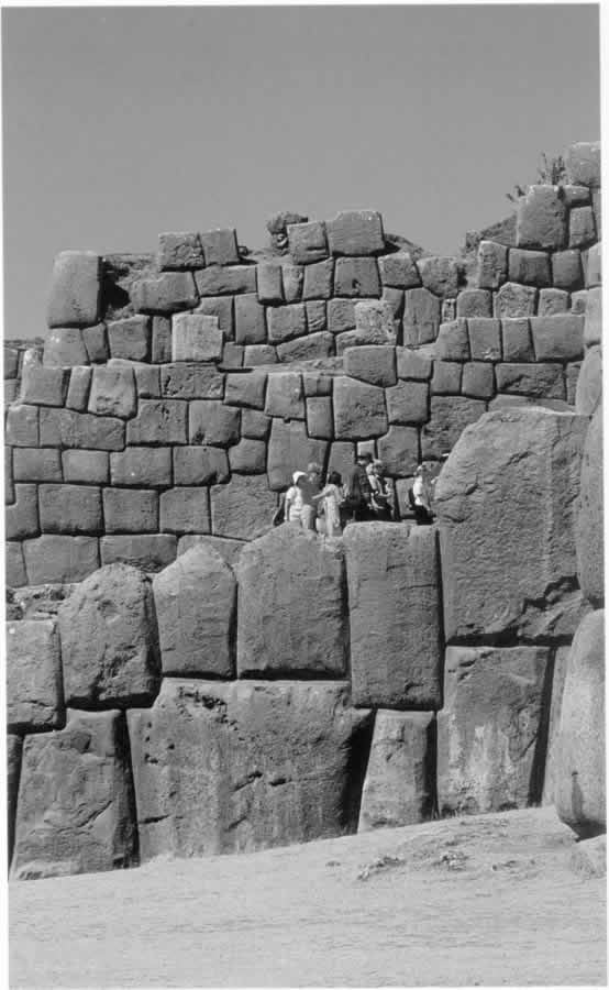Fig. 5dp-20c. Tall wall of huge stone blocks that fit together perfectly well. Cuzco, Sacsayhuaman, Peru. The wall was built by the “ancient” Incas. As we have explained above, the technology must have involved the placement of cloth sacks with liquid concrete between wooden boards that defined the general shape of the wall. When the concrete hardened, the blocks assumed an ideal shape. Taken from Alexandra Arellano’s book entitled "All Cuzco. Peru". - Fisa Escudo de Oro. Centre of Regional Studies of the Andes "Bartolome de las Casas", Lima, Peru. Instituto de Investigacion de la Facultad de Turismo y Hotelria, Universidad San Martin de Porres, 1999, page 27.