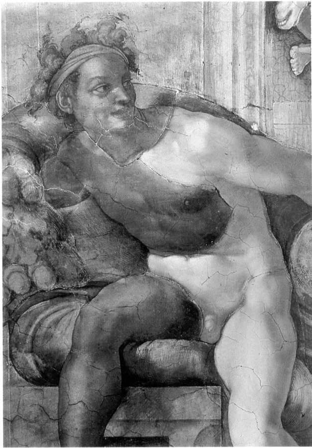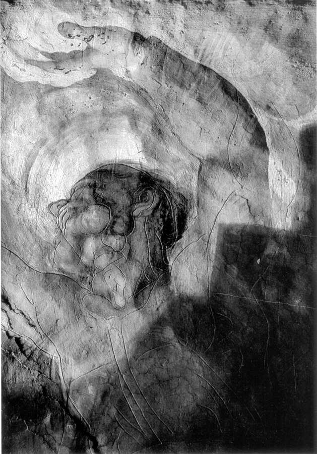 Fig. 5dp-24. As we have already mentioned (see CHRON1, Chapter 1:13.3), the general public is puzzled about the rapidly deteriorating condition of the allegedly ancient works of art, sculptures, paintings and buildings, which is seen as a recent phenomenon. After all, Scaligerian history tries to convince us that these artefacts have remained intact for hundreds and even thousands of years. The suggested explanation is the allegedly perilous influence of the modern industry. However, the real reason is different. As we realise today, the Scaligerian millennia are a phantom; the erosion rates have always been rather high. We reproduce a rare photograph of restoration works in the Sistine Chapel as proof. The darkening and dilapidation of the frescoes make it impossible to make out any details at all. The “reconstructed originals” shown to us today were all painted by the modern restorers. We have no means of estimating the reproduction accuracy. The very idea of restoring old artwork (as well as making replicas of antiques) came into being during the Reformation, stimulated by the need of creating a new picture of the past that would meet the needs of the new rulers. Therefore, the most valuable ancient documents and works of art are the ones that have escaped the caring hands of the restorers. Semi-dilapidated originals are much less of a sight than the exquisite replicas – however, they are a lot more likely to be authentic. Let us reiterate that the bright colours of the Sistine frescoes have nothing to do with Michelangelo himself, which is highly deplorable. His art fell prey to relentless time. What we see today is the art of the restorers “based on Michelangelo’s motifs”. Taken from “The Sistine Restoration. A Renaissance for Michelangelo”, an article by David Jeffery published in the National Geographic magazine, Vol. 176, #6, December, 1989 (page 696).