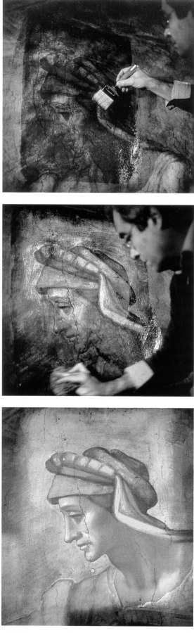 Fig. 5dp-22. Ever since the decline of the Great = “Mongolian” Empire in the XVII century and the radical revision of history that followed, we have been deliberately fed the myth that historical realities known to us today have always been this way. First and foremost, the myth about the world changing very slowly was a political necessity: the new rulers of the Reformation epoch were in need of “substantial proof” in order to back their claims for the throne, tracing their lineage back to times immemorial. This myth of “antiquity and rigidity” expanded to include the surviving historical artefacts. The makers of Scaligerian history dated the works of mediaeval writers, artists and craftsmen to deep antiquity, assuring everyone that the works in question have been around for hundreds and even thousands of years without suffering much damage inflicted by age. However, this claim has been proven preposterous by the destruction rate of mediaeval artefacts registered today. Only a very limited number of professional restorers are aware of just how fast the ancient works of art (paintings, frescoes, statues etc) darken and erode. Museum visitors usually see the end result of the restorers’ efforts, completely unaware of their being confronted by embellished and “revamped” history. In order to illustrate our point, we reproduce a rare photograph where one sees the actual process of Michelangelo’s XVI century Sistine Chapel frescoes being restored at the end of the XX century. The lighter part of the artwork represents the results of the restorers’ efforts. The rest, which looks much darker, corresponds to the natural condition of Michelangelo’s frescoes after the passage of some time (one must also bear in mind that the restoration works in question were by no means the first ones conducted in the Sistine Chapel. It has to be said that the actual conception of renovation is highly ambiguous per se. Today such endeavours are seen as “noble efforts aimed at the preservation of humanity’s cultural legacy” – however, more often than not this translates as the replacement of the dilapidated original by a blatant replica created by our contemporaries in accordance with the guidelines of Scaligerian history. It would be much better for the preservation of historical truth (and a great deal more honest to boot) to preserve the ancient artefacts in the exact same condition that they had when they were discovered. Renovation, which is often de facto rendered to painting an “ancient fresco” anew, filling the gaps with the products of one’s own artistic imagination, has every reason to be regarded as forgery. Making the past look “better” is an act of forgery at the end of the day, no matter how noble the motivation. Taken from “The Sistine Restoration. A Renaissance for Michelangelo”, an article by David Jeffery published in the National Geographic magazine, Vol. 176, #6, December, 1989 (page 696).