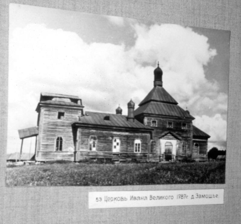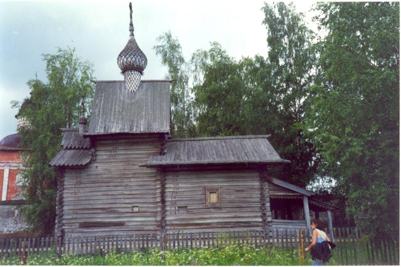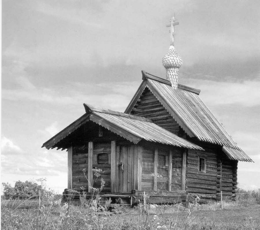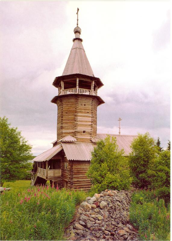 Fig. 5dp-28. Ancient wooden Church of Lazarus Risen (from the Monastery of Murom, late XIV – early XV century). Nowadays it is part of the Kizhi ensemble on an island in Lake Onega. Its style is typical for the ancient Russia (also known as the Horde and the “Mongolian Empire”), and is easily identifiable as the famous Gothic style familiar to us from the architecture of the Western European cathedrals (see CHRON4, Chapter 14:47). Postcard from the collection by B. Savik and V. Parkkinen called “Kizhi. Open Air Museum”. See CHRON4, Chapter 14:47 for more details.