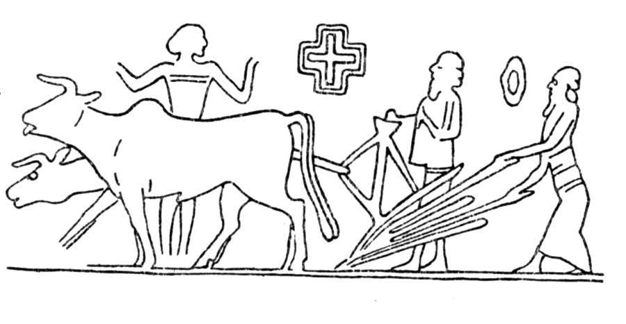 Fig. 5dp-37. “The image of a sowing plough embossed on clay with a cylindrical matrix (around 1400 B. C., Mesopotamia). Taken from The Concise Soviet Encyclopaedia, Moscow, 1928, Volume 1, pages 159-160. However, what we see on this “antediluvian” embossment is a typical Christian cross. The finding is therefore unlikely to predate the XII century A. D.
