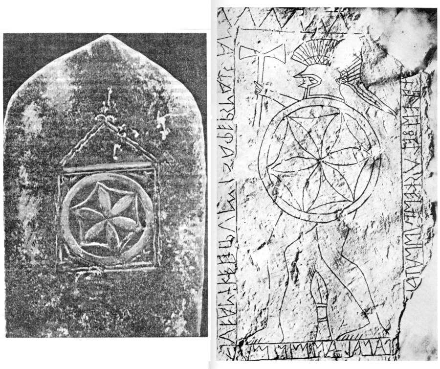 Fig. 5dp-39. On the right we see the memorial Etruscan stele of Avles Feluske, allegedly dating from the V century B. C. (Vetulonia, Italy). Kept in the Florentine Museum of Archaeology. Taken from [1410], page 247; see also [574], page 114. On the left we reproduce the rear side of a XVI century stone monument from the village of Middle Aty in Tartarstan, Russia. This photograph was reproduced in G. V. Yousoupov’s work entitled “An Introduction to the Bulgar and Tartar Epigraphy” (1960), page 152. We are using a reproduction of this extremely valuable snapshot taken from a more recent publication of Nurikhan Fattakh entitled “Language of the Gods and the Pharaohs”, Kazan, Tatarskoye Knizhnoye Izdatelstvo, 1999 (page 271). The two ornaments are virtually identical to each other – the “ancient” Etruscan stele reveals itself to be a relation of a Tartar monument of the XVI century located in Russia. We see a six-pointed star circumscribed by a hexagon and then also a circle. On the Etruscan stele the “Star of David” (apparently a religious symbol used by all Orthodox Christians at some point) decorates the shield of an Etruscan warrior. According to our reconstruction, such close proximity between the Tartar symbols and their Etruscan counterparts can be explained by the colonization of the Western Europe (Italy in particular) by the Horde in the XIV century, whose vestiges were later ascribed to the “ancient Etruscan civilization”.