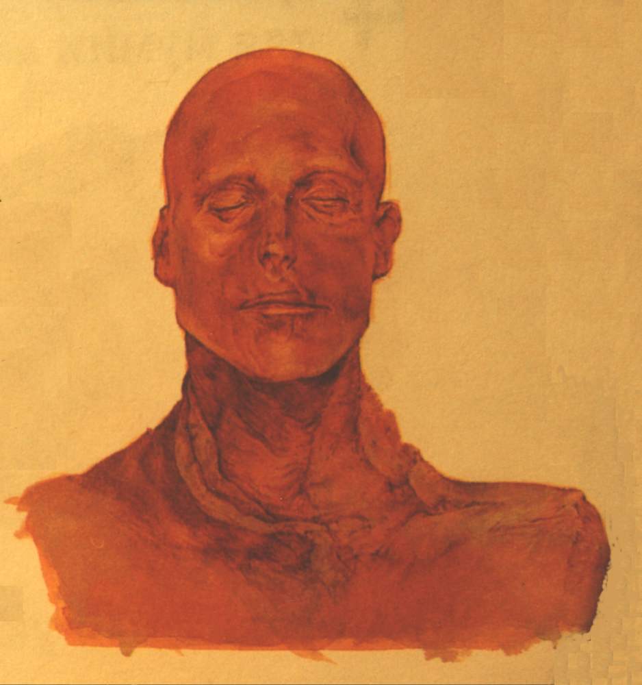 Fig. 5dp-12. The mummy of the Egyptian Pharaoh Seti I. According to our reconstruction, the Egyptian Pharaohs buried in the Valley of the Kings were really the Czars of the Great Empire, a mediaeval state whose capital was in the Vladimir and Suzdal region of Russia in the XIV century and later. Mark the explicitly Caucasian features of the Pharaoh’s face – his Slavic origins seem very plausible indeed. Incidentally, his tomb in the Valley of the Kings is one of the most lavish ones. Its ceiling is decorated with a zodiac that hasn’t been deciphered or dated yet. Taken from “Mummies” by Philip Steele (Moscow, Machaon, 1999), page 74. The authors are referring to the Russian edition of the book published by King Fisher Publishers, New York, in 1998.