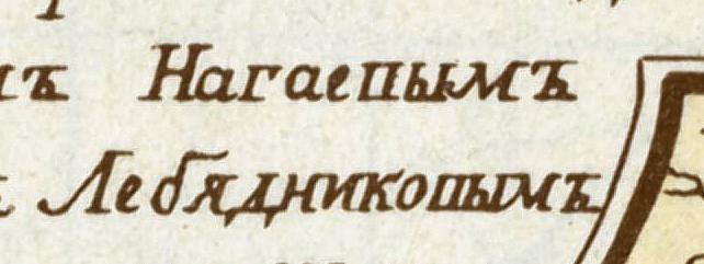 Fig. 1.13. The inscription on the map of Captain Nagayev transcribes the letters В “V” and П “P” in the same manner – today we would write the names НАГАЕПЫМ (Nagayep) and ЛЕБЯДНИКОПЫМ (Lebyadnikop) as НАГАЕВЫМ and ЛЕБЯДНИКОВЫМ (Nagayev and Lebyadnikov, respectively). Taken from [73].