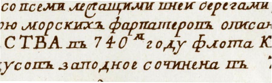 Another naval chart of Captain Nagayev (Nogay?) dating from 1750 can be seen in fig. 1.9. The date in the top right corner is already transcribed in the modern fashion, as 1750, qv in fig. 1.10. However, in the top left corner we see the date and the name of the map’s actual compiler, which, amazingly enough, tells us that one part of the map was described by Nagayev in the year of 721, and the other – in 743, by the same character. Once again, there is no figure of one in the beginning of the date (fig. 1.11). Therefore, both dates were transcribed in the old fashion, sans “thousand”. The cartographers of captain Nagayev (Nogay) must have vaguely remembered the mediaeval tradition (which was a hundred years off the mark), according to which the Nativity of Jesus Christ had taken place 750 before their time, and not 1750; simultaneously, we see the very same date transcribed on the same map as 1750, which is the modern fashion.