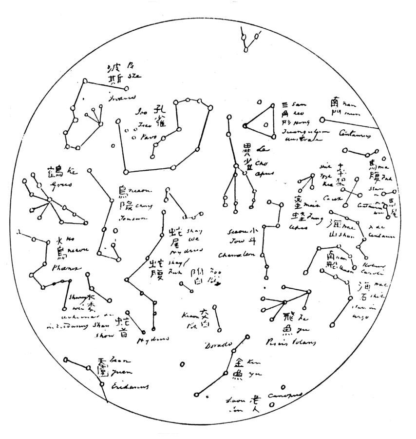 Fig. 5.2. Chinese star chart of the XIX century. Southern Hemisphere. N. A. Morozov wrote the following about these star charts: “In order to picture just how naïve Chinese astronomy was as recently as in the XIX century, I suggest to consider the following six star charts from the book of John Williams . . . The readers shall instantly recognize . . . Ursa Major, but that is the only constellation here that looks familiar. Nearly every constellation looks untypical; also, the lack of a coordinate grid leads to an almost childishly naïve disposition of star configurations that renders them unidentifiable in most cases” ([544], Volume 6, pages 64 and 69). Taken from [544], Volume 6, page 69.