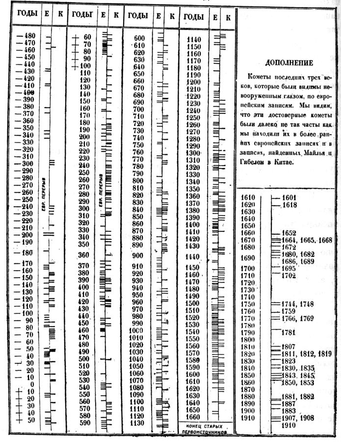 These considerations make us admit that the Chinese comet roster looks exceptionally strange. N. A. Morozov was perfectly correct to write: “Our modern and exact knowledge of the amount of comets visible to the naked eye registered over the last three centuries make it perfectly obvious that these interstellar vagabonds don’t quite rain over us in such abundance as one finds in the roster [of Chinese comets – Auth.]” ([544], Volume 6, page 60).