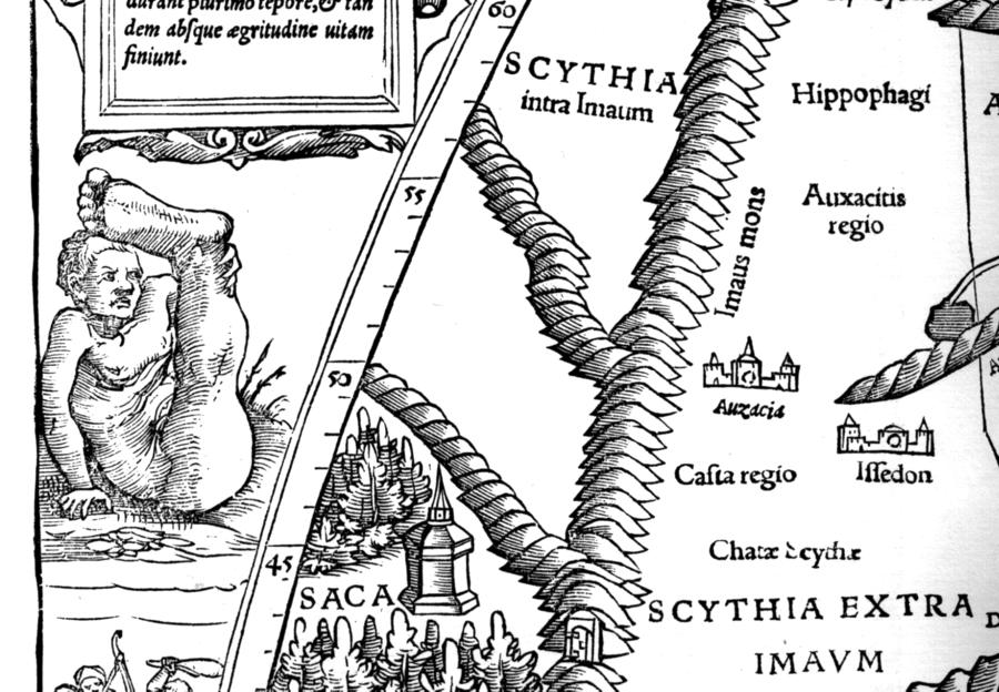 People who sleep on their backs and hold their only foot of an enormous side above them to find shade, or the so-called sciapodes [see fig. 8.17 – Auth.].