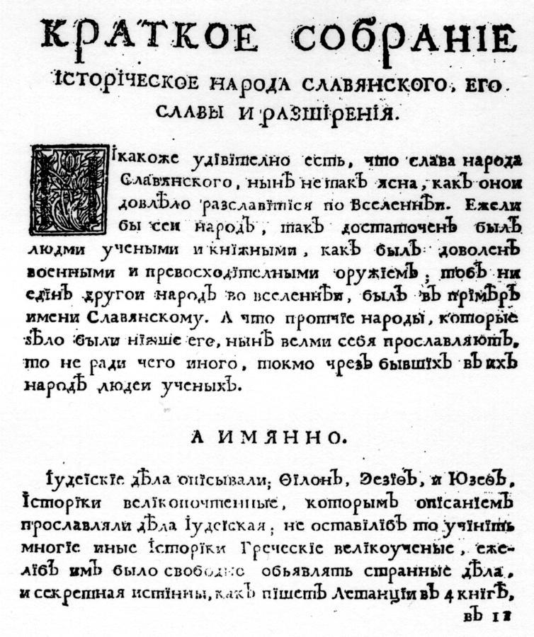 One must emphasise that the Russian edition of Orbini’s book came out as a result of a direct order given by Peter the Great. The title page of this edition tells us the following: “Translated from Italian to Russian and published at the order of Peter the Great, Emperor and Autocrat of All Russia etc, in the epoch of his glorious reign. The typography of St. Petersburg, 20 August, 1722” (see [617]).