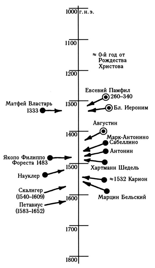 Seeing as how historians themselves credit these characters with the creation of the global chronology in its first rough version (as a “periodic distinction”), we are brought to the following important hypothesis. The first rough schemes of the global history were created in the XV-XVI century the earliest courtesy of Eusebius, Jerome and Augustine.