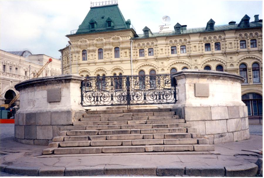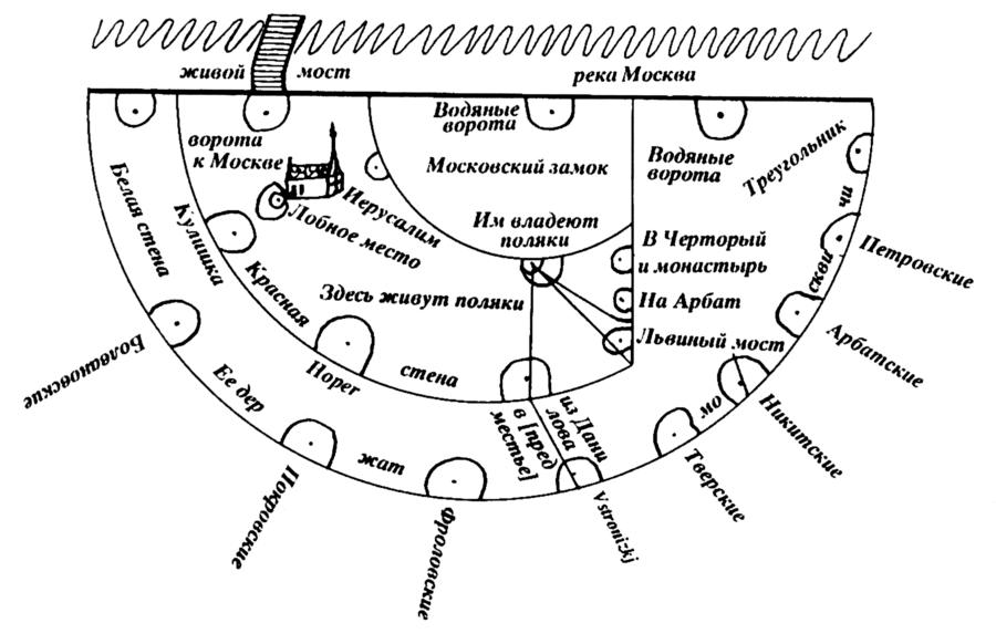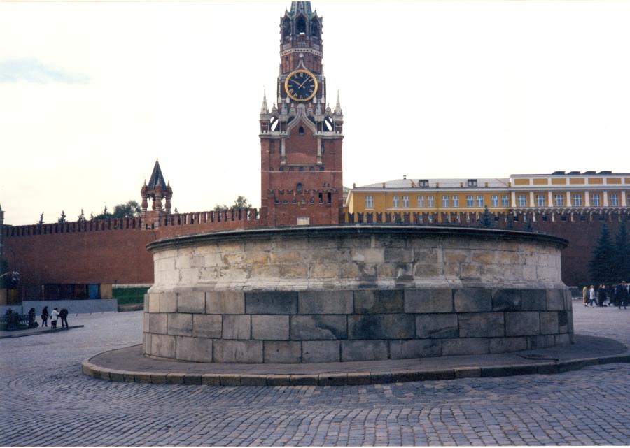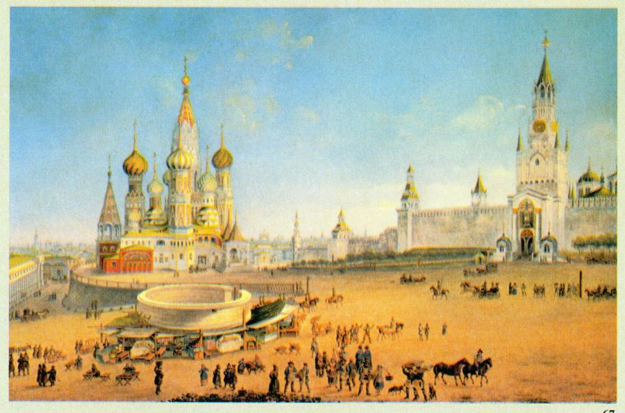 The famous “Lobnoye Mesto” on the Red Square in Moscow (literally, the “Frontal Site”) was apparently designed to be a holy place for all the Christians ([305], page 159; see figs. 12.6, 12.7 and 12.8). It was supposed to commemorate the Golgotha, with a skull (or “Adam’s forehead”) located underneath, as it was drawn by numerous mediaeval artists. A famous ancient drawing of the “Lobnoye Mesto” in a plan of 1600 can be seen in fig. 12.9. A view over the site in question as well as the Church of St. Basil painted in 1820-1830 can be seen in fig. 12.10.