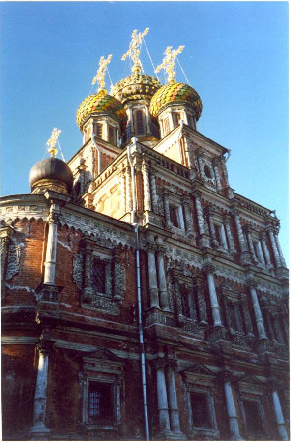 As a matter of fact, the tradition of building Orthodox churches with domes looking like the Cossack, or the Ottoman = Ataman turban existed until the XVII century at least. For example, let us consider one of the XVII century churches in Nizhniy Novgorod. It is the famous Stroganov Church of Nativity close to the bank of the Volga. The entrance to the church is via a staircase that leads to the second floor. The domes of the church are decorated with spiral ornaments and closely resemble the domes of the Muscovite St. Basil, qv in figs. 12.14a and 12.14b. Bright spiral stripes on the domes are made of small multicolour tiles, therefore the black and white illustration that we reproduce does not convey the whole splendour of this sight, which one can see upon a colour photograph. Many Russian churches of the Horde must have possessed similar turban-like domes; however, ever since the reform of the architectural style by the Romanovs, the few surviving churches of this kind have been perceived as rarities and oddities.