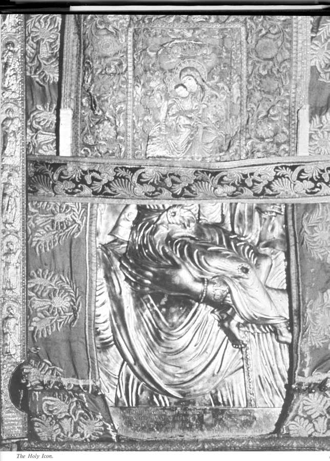 Nowadays the visitors to the Kykkos Monastery can only see the icon as it is represented in fig. 12.43. The face of Our Lady is covered; the slot in the cover only reveals the encasement. The icon is therefore completely hidden from sight. The encasement is new, made in 1795, qv above. The old encasement of 1576 can be seen in the actual Church of the Kykkos Monastery ([997], page 25; see fig. 12.44). The old encasement houses another icon of Our Lady ([997], page 35; see fig. 12.45). Therefore, nowadays we can only see the old XVI century encasement with a different icon inside, and not the authentic icon painted by Apostle Luke.