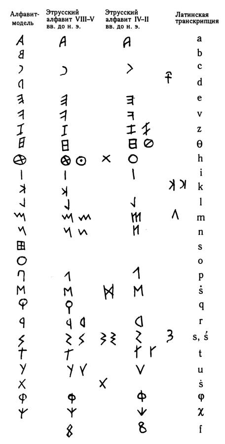 The table was borrowed from the work of Volanskiy ([338], page 103). Pay close attention to the similarity between the Cyrillic letters and their Etruscan counterparts from the fourth column. About a third of all the letters found in Etruscan alphabet are the same as their Cyrillic counterparts. Actually, we have already cited a XVII-century Russian inscription where only about one third of all letters were Cyrillic, and other symbols used for representing all the others (see CHRON4, Chapter 13:6 and CHRON5, Chapter 3:1). We see a similar situation to be the case with the Etruscan alphabet – Cyrillic letters comprise one third of the alphabet; the remaining symbols are different.