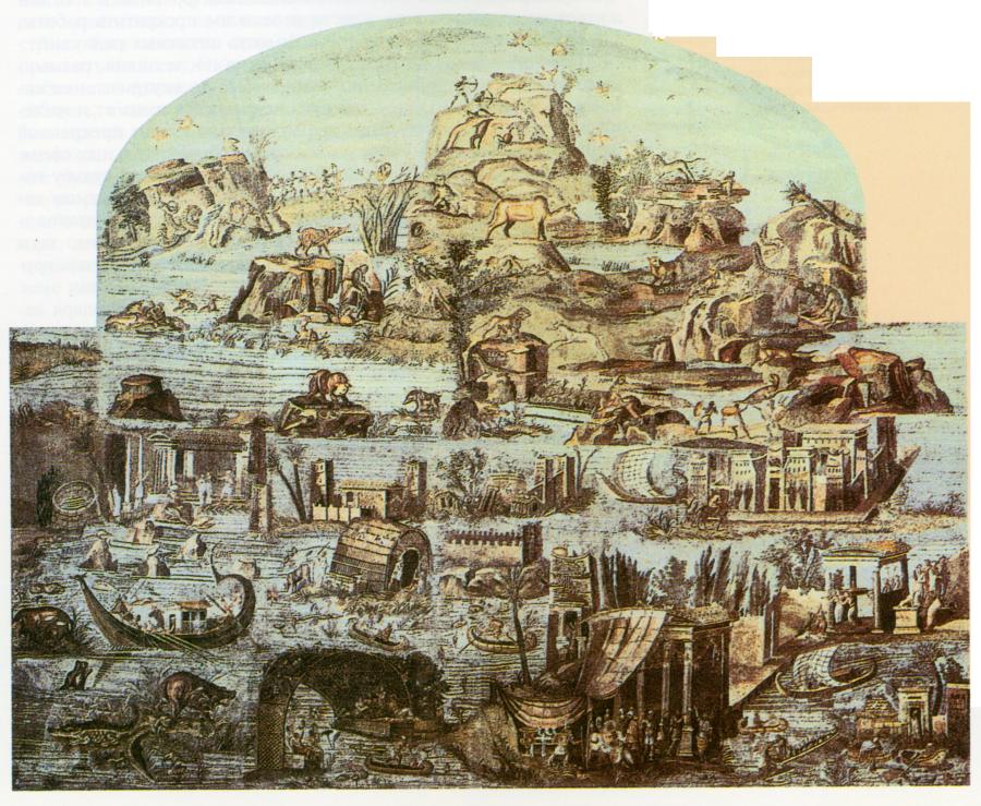 In this regard, let us pay attention to the Roman inlays of the alleged II or III century A. D. depicting the “ancient” Egypt ([726], page 100). We reproduce it in fig. 19.3. Modern historians write the following about them: “These artful Roman inlays of the II or III century A. D. very skilfully depict the miracles of the Nile Valley - from the source lost in the Ethiopian mountains to the delta of the river and the city of Alexandria” ([726], page 101).
