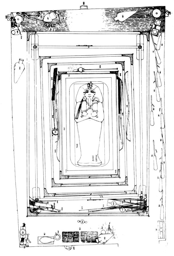 5) Inside the last chapel there was a deluxe sarcophagus made of reddish quartzite whose corners were guarded by four reliefs of winged goddesses . . . The golden hearse was inside; it is hard to understand how it could have supported all this enormous weight for thousands of years” ([484], page 135).