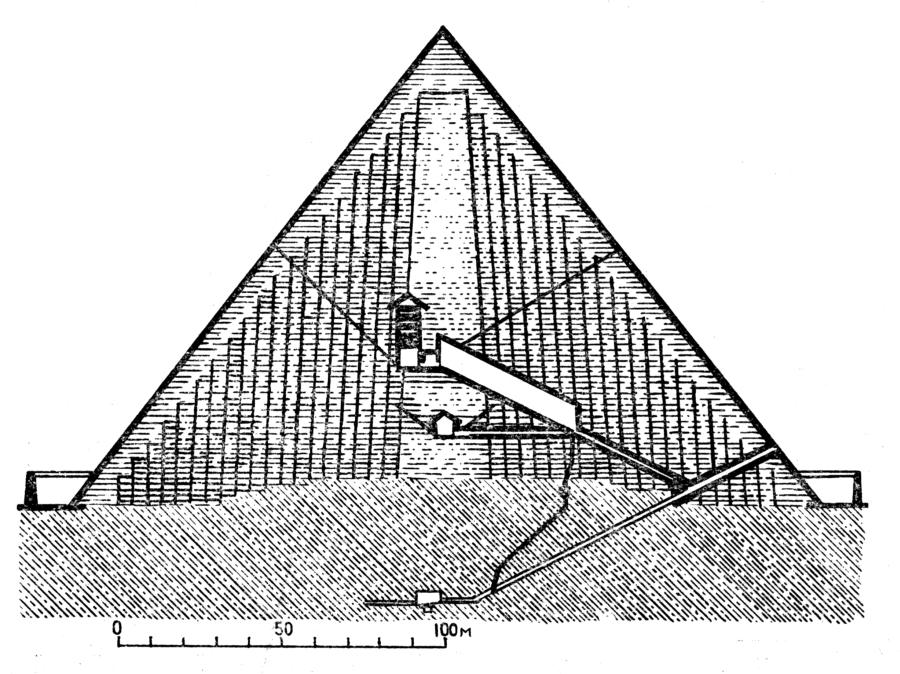 201 layers of the Cheops Pyramid's masonry remain intact. Its summary weight is estimated as 6.5 million tonnes. The height of the stone blocks in the first layer of the pyramid's base equals 1.5 metres. The second layer is 1.25 metres high. The height of the following rows of blocks keeps diminishing and then fluctuates between 65 and 90 centimetres ([464], page 30). A section drawing of the Khufu (Cheops) Pyramid can be seen in figs. 19.21 and 19.22, and a section drawing of the Mikerin Pyramid is reproduced in fig. 19.23.