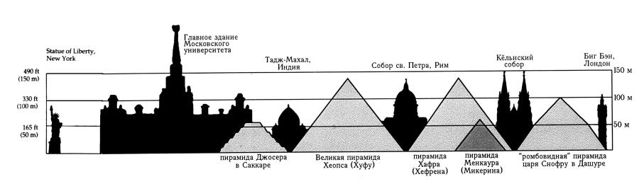 The main word used by the Egyptologists Brugsch, Mariett, Lauer and many others in order to describe the Great Pyramids and other constructions of the "ancient" Egypt is "monstrous". These constructions are impressive indeed. In fig. 19.24 we see comparative sizes of the great Egyptian pyramids and certain other large modern and mediaeval constructions.