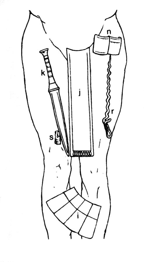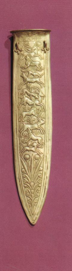 In fig. 19.27 one sees a photograph of the burial chamber in the Cheops Pyramid, the way it looks today. At the bottom of fig. 19.28 there is an iron dagger discovered in the tomb of Pharaoh Tutankhamen, right on his mummy ([1366]). The respective positions of the iron and golden dagger on the Pharaoh's body are indicated in figs. 19.29 and 19.30. Iron armaments in the tombs of the "ancient" Pharaohs blatantly contradict Scaligerian chronology, and correspond with our reconstruction perfectly well. Incidentally, the sheath of the golden dagger is decorated with artwork that depicts Czars hunting animals that resemble bulls or deer with hounds (see fig. 19.31). Czars of the Horde, or Russia, were very fond of this pastime. It has to be noted that we see no African animals here, such as lions, camels etc.
