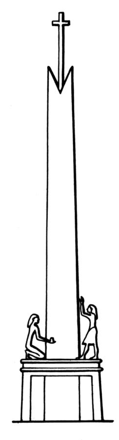 In fig. 19.40 we reproduce a picture of the "ancient" Egyptian Obelisk of Iunu crowned by a huge Christian cross. The latter has no loop and has the exact same shape as the conventional Christian crosses. This obelisk was of great significance - it was built in Iunu, or Heliopolis, one of the most important religious centres in Egypt. According to historians, "the ancient Egyptian City of Pillars, or Iunu, also known as Onom, remained a religious centre of paramount importance for almost three thousand years. The Greeks baptised it Heliopolis - 'City of the Sun' . . . In the middle of the III millennium B. C. Heliopolis became the centre of the cult that worshipped the Almighty Creator as the God of Sun" ([486], page 15). As we realise today, the Christian Egyptian city of Heliopolis really emerged as an important religious centre in the XIV century the earliest. Its formidable obelisks were built in the XV-XVIII century. Incidentally, has the obelisk topped with a large Christian cross survived? Why are we only shown a drawing of this monument today? Could it have been destroyed in the course of the Napoleonic programme aimed at "helping Egypt to go towards the light" (see [484], pages 80-82)?
