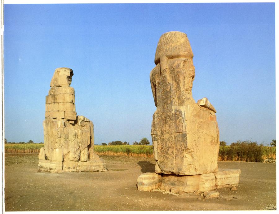Thus, both of the "ancient" Memnon Colossi allegedly dating from the XIV century B. C. were built as enormous Christian symbols. The gigantic statues of the "ancient" Egyptian pharaohs sit upon thrones adorned with Orthodox crosses.