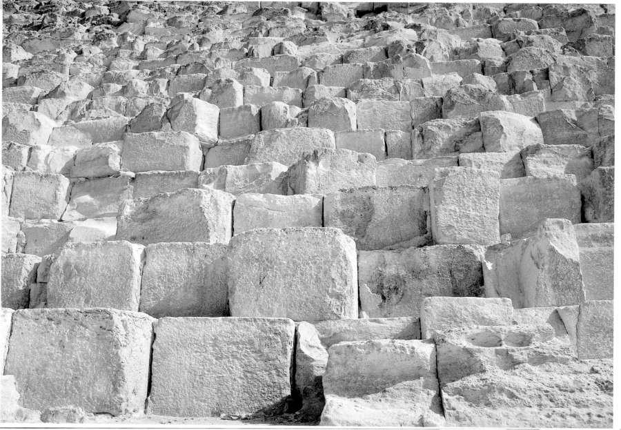 Let us now consider the construction of the largest Egyptian pyramids in Gizeh. We are told that the Egyptian pyramids were built of monolithic stone blocks that were brought from quarries located at a great distance, and piled up against each other in a mysterious way ([99] and [464]). Some of the resulting stone constructions are over 100 metres high; for instance, the height of the Cheops Pyramid equals some 140 metres. In figs. 19.51, 19.52 and 19.53 we see the masonry of the Cheops Pyramid. However, the sheer size and height of these megalithic "ancient" constructions fail to correspond with the capacity of the ancient builders.
