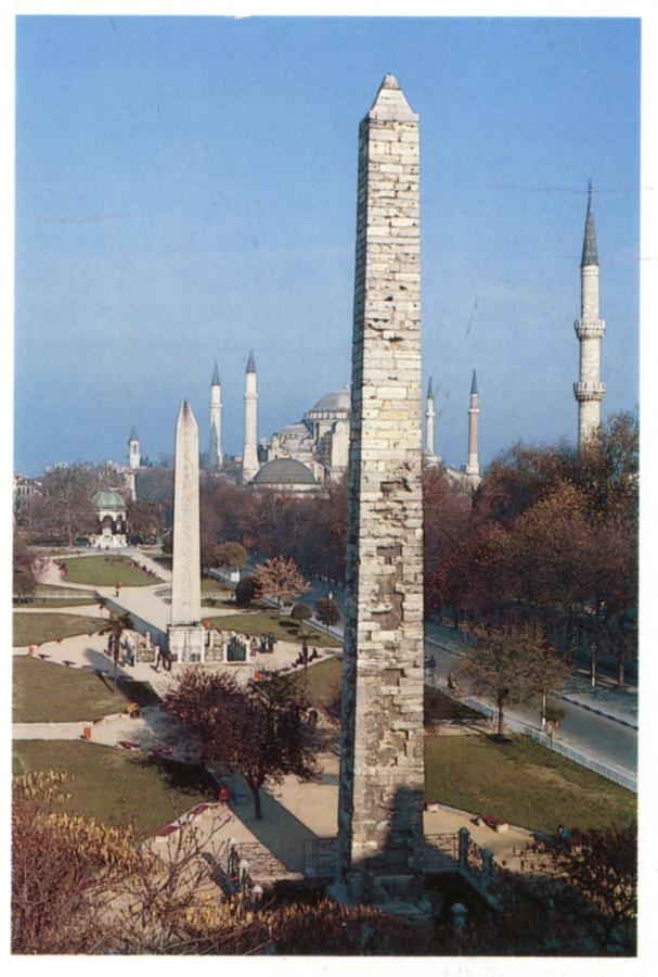 Coming back to the "ancient" Egyptian obelisks, we can now voice the idea that many of them were either cast of concrete or simply built of small blocks. The whole construction would then be covered by a layer of concrete or plaster. This is precisely how the famous 25-metre obelisk of Constantine was built - the one that stood at the Hippodrome of Czar-Grad, qv in fig. 19.65/66. It is presumed that the obelisk was erected by Constantine VII Porphyrogenetus in the alleged year 940 ([1464], page 48). The column was presumably "coated in gilded bronze plates with reliefs depicting the heroic deeds of the Emperor's uncle, Basil of Macedonia [the King of Macedonia, in other words - Auth.]" ([240], page 167). The concrete coating peeled off over the course of time, revealing the numerous small blocks of stone that the obelisk was built of, qv in fig. 19.67. A propos, the column was also known as the "Walled-Up Column or the Golden Column (Colossus)" ([240], page 166).