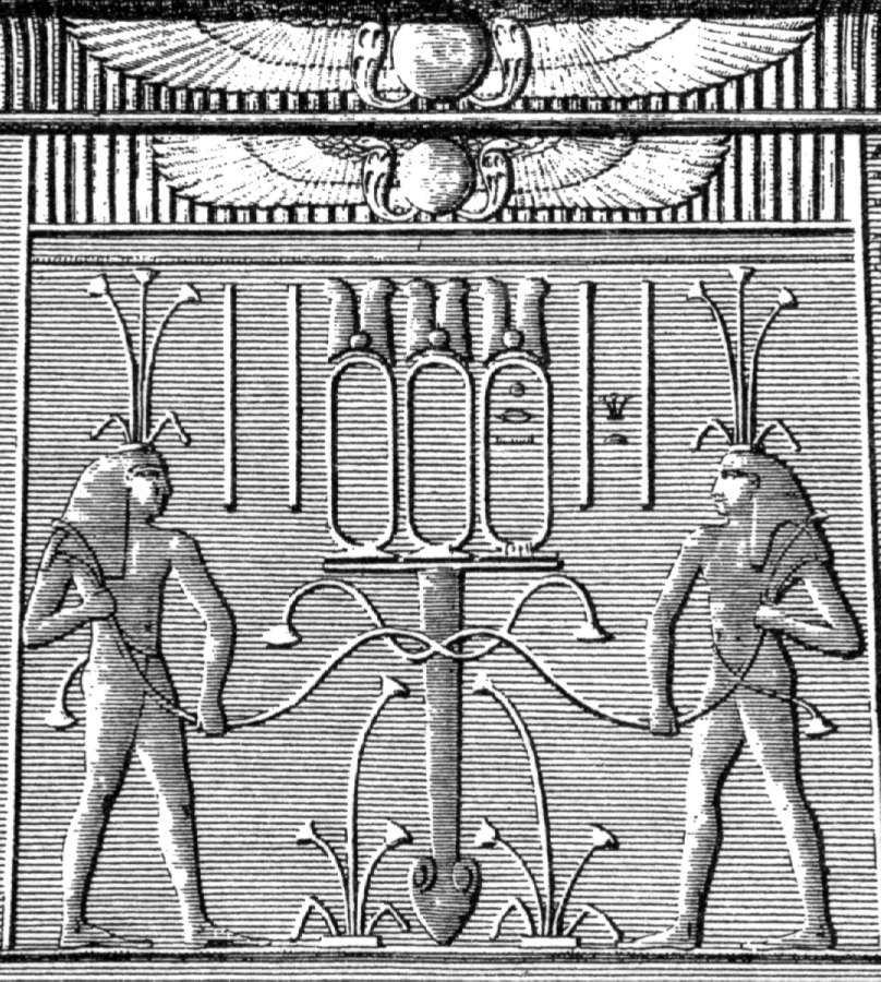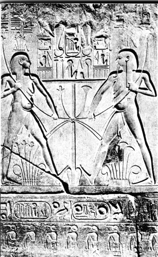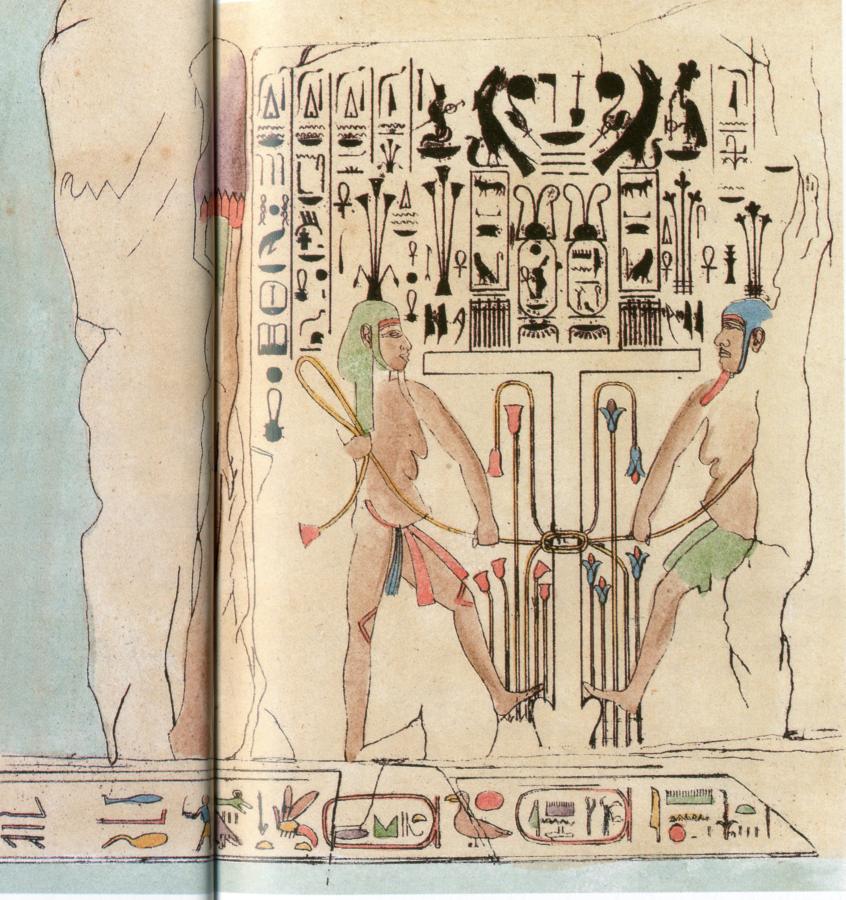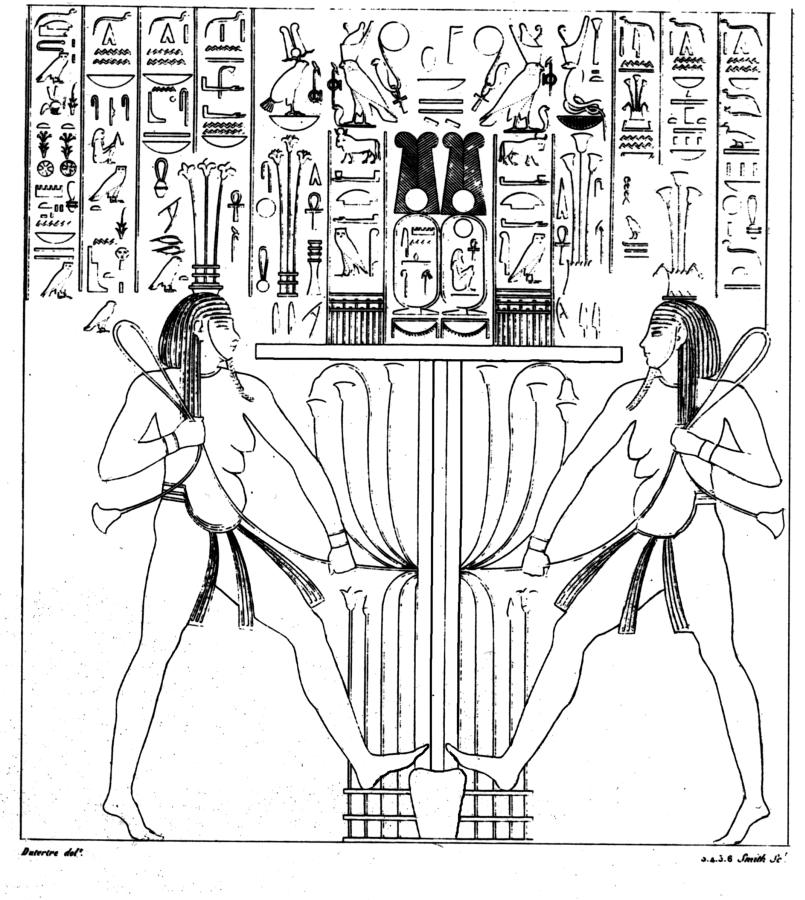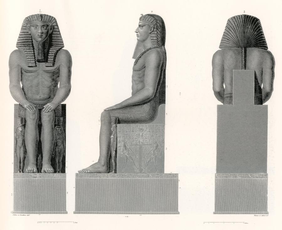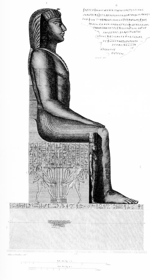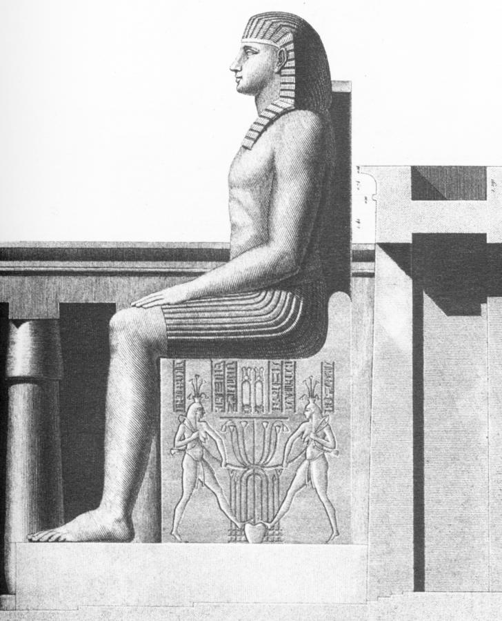 In fig. 19.127 we reproduce the drawing of a side of the Colossus made in 1832 by Frederick Catherwood. In fig. 19.128 one sees a drawn copy of the actual motif in question from the side of the throne. Once again, it is expedient to compare the drawing of Catherwood (fig. 19.128), the drawing of Napoleon's artists (fig. 19.124) and the modern photograph (fig. 19.47).