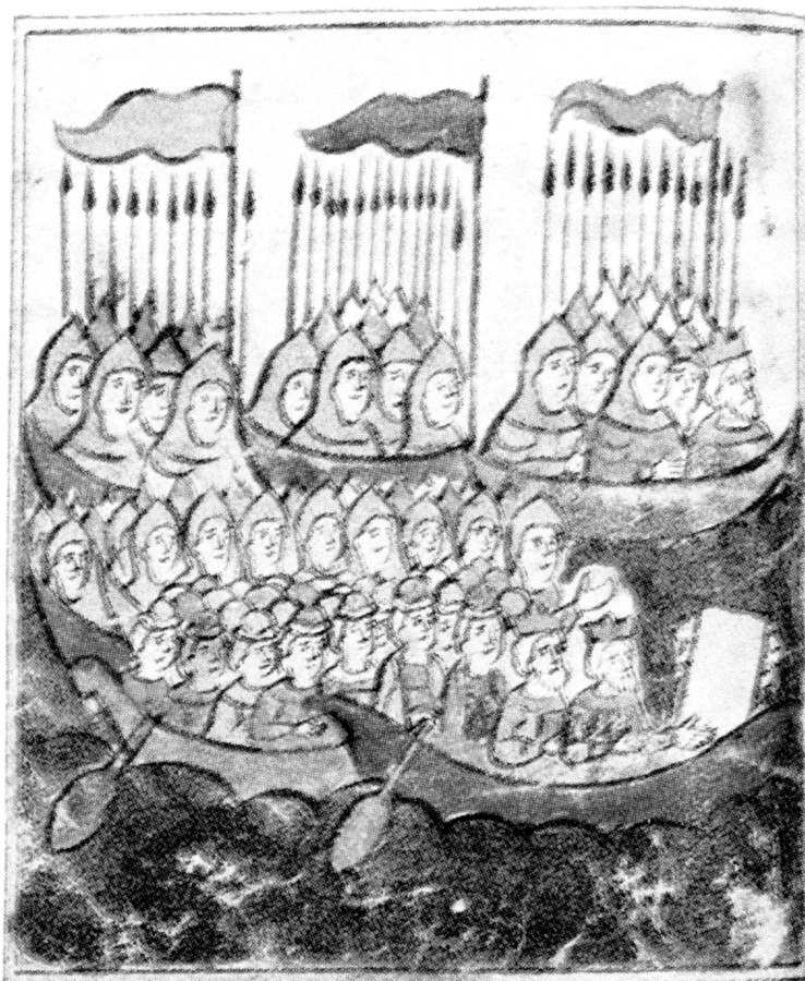 We must point out that the drawings of the old Russian rowboats are very similar to the boats of the Pharaohs. The same characteristic shapes and the same tall head and stern with curved ends. Russian rowboats are crescent-shaped, likewise the boats of the pharaohs. Russian rowboats can be seen in figs. 19.143, 19.144 and 19.145. In figs. 19.145 and 19.146 we see old drawings of Byzantine rowboats, which seem to be just the same as their Russian counterparts in shape and construction.