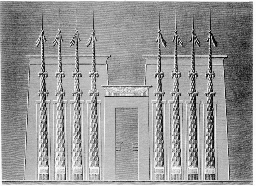 Indeed, let us turn to the history of the "ancient" Egypt, for instance. In fig. 19.115 we see the right half of the facade of an enormous temple in the "ancient" Egyptian city of Karnak. There are eight Cossack bunchuks over the temple - four on the left and four more on the right. The drawing was made by the artists of Napoleon when his troops invaded Egypt at the very end of the XVIII century ([1100]). It is perfectly clear that the bunchuks as used by the Horde and the Ottomans, which were topping the temples of the "ancient" Egypt, used to symbolise the power of the "Mongolian" Empire, which also included Egypt in the epoch of the XIV-XVI century. In fig. 19.116 we can also see tall bunchuks of the Cossacks and the Atamans near the southern entrance to the Great Karnak Temple ([1100]). One must note that there was another symbol of the Empire flowing over the temple entrance. Its heads look serpentine, facing left and right (fig. 19.117).
