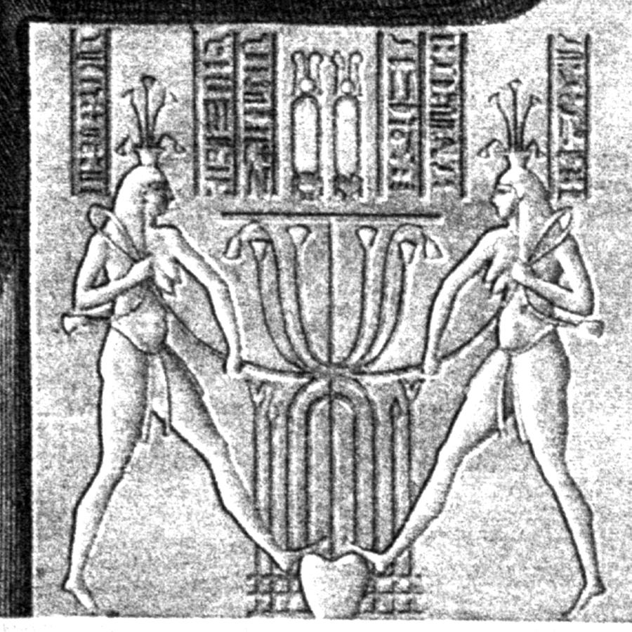 It has to be said that the Exaltation of the Holy Cross must have been a popular enough motif in the "ancient" Egypt. Apart from the Colossi and the temples of Memnon, we can see it in a similar bas-relief from Phile, for instance (fig. 19.129). The T-shaped cross is very recognizable here (fig. 19.130). By the way, one must also note the three imperial "Mongolian" bicephalous eagles spreading their wings over the scene.