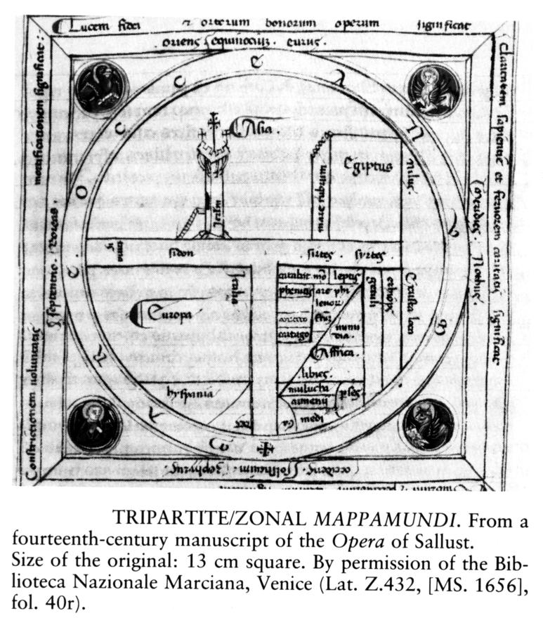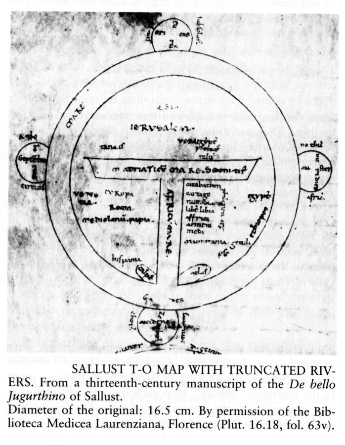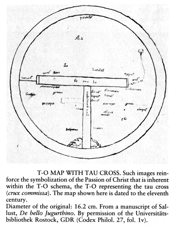 The fact that the "ancient" Egyptian bas-reliefs from the Memnon Colossi depict the Christian cross becomes obvious from a comparison with some of the ancient world maps, where the Christian cross that divides the world into three parts has the shape of the letter T; this is recognized by historians themselves. Examples of such maps can be seen in figs. 19.132, 19.133 and 19.134.