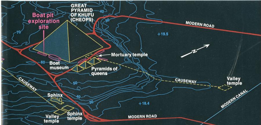 The site of the finding is indicated in fig. 19.141, which we took from [1281], page 520. Fig. 19.142 represents a section view of the subterraneous chamber that conceals the boat. Egyptologists and archaeologists date both royal boats to the epoch of the "ancient" Egyptian Pharaoh Khufu, or Cheops ([1281], page 522). They are considered to be funereal boats, and their age is said to equal 4600 years ([1281], page 514). The first one was used for the transportation of the body of Pharaoh Cheops ([1281], page 520). The second boat accompanied the first. The length of the first boat equals 142 feet, or 43 metres; the second boat is of a similar size.