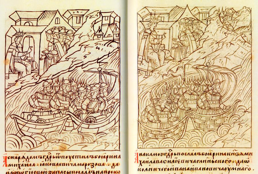 On the other hand, our reconstruction suggests a different explanation, which appears more natural to us. Apparently, the "Egyptian Pharaohs" were the Czars, or Khans, of the Great = "Mongolian" Empire, whose residence was at a considerable distance from Africa and the country known as Egypt today - in Russia, or the Horde, that is, or the Ottoman (Ataman) Empire. They were embalmed posthumously and embarked on a long voyage on seafaring vessels. This fact appears to have become reflected in the "ancient" Greek myth of Charon, the ferrymen of the dead who took them to Hades across the Styx. The embalming procedure was necessary for the preservation of the bodies during the long journey across the sea.