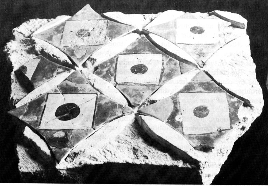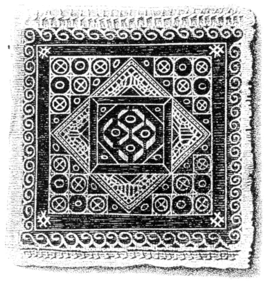 We cite mediaeval Slavic ornaments for comparison in figs. 19.156, 19.157 and 19.158. They were depicted in the mediaeval Serbian frescoes ([276] and the inlays of the ancient Bulgarian capital - Velikiy Preslav ([1411]). One of the most common elements of these ornaments is a cross inside of a square - a straight cross (fig. 19.156) or a slanted cross (figs. 19.157 and 19.158) surrounded by four marks - usually circles or dots. The same ornament can be seen in the centre of the "ancient" Egyptian embroidery.