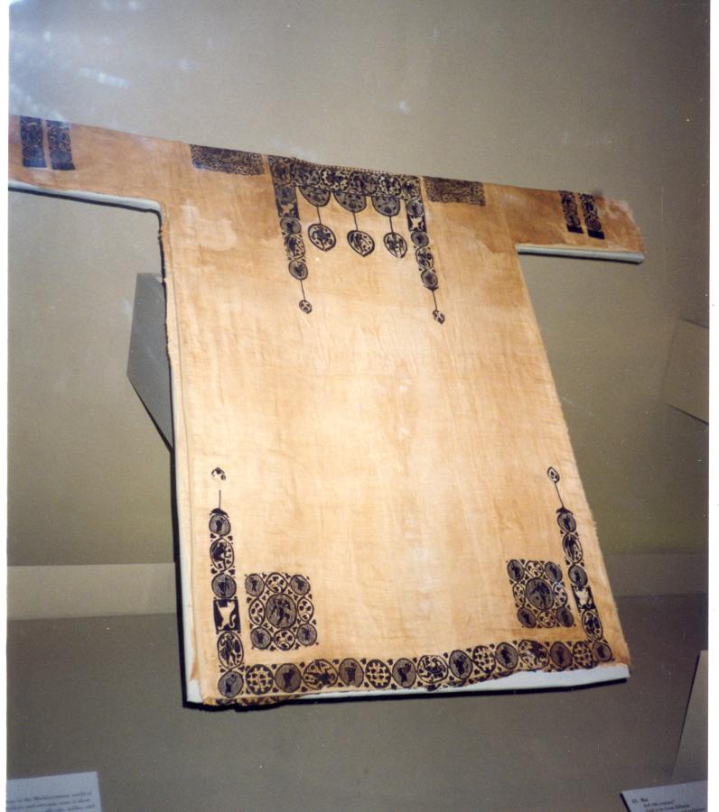 In fig. 19.153 we see an "ancient" Egyptian shirt found in the Memphis region. It is adorned with an ornament; a close-in of said ornament's fragment can be seen in fig. 19.154. This ornament is known to be Slavic. At the centre we see a cross surrounded by four circles and circumscribed by a square. Apart from that, the embroidery has many Qatar crosses circumscribed by circles. Another "ancient" Pharaoh's shirt with Slavic ornamentation can be seen in fig. 19.155. It is believed that the Christian Qatar crosses originated from Bulgaria, and later propagated all across Europe. See CHRON6 for more details.