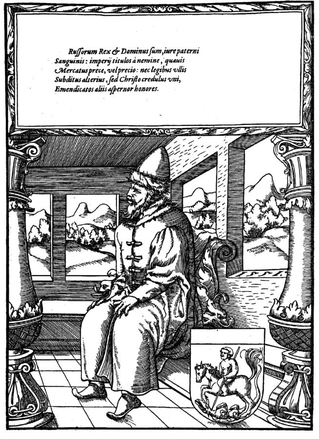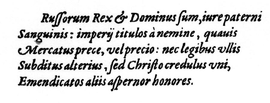 It would be interesting to compare this passage to the words found on the portrait of Vassily III, the Russian Czar, quoted by the mediaeval traveller Sigismund von Herberstein in his famous “Notes on Muscovite Affairs” ([161], page 69; see figs. 20.5 and 20.6). The words are as follows: “I am Czar and ruler by birthright; I asked no one for my royal title, nor did I buy it from anyone – there is no law to make anyone my superior. But, trusting in no one but Christ, I reject the rights begged from others” ([161], page 69).