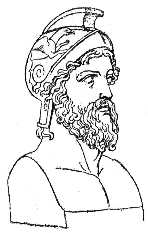 "Марафон... - селение в Аттике, верстах в 30 к северо-востоку от Афин, на Марафонской равнине, у подножия Пентелика... Находилось на месте нынешней деревни Vrana, немного южнее деревни Marathona, которая прежде отождествлялась с древним Марафоном, прославленным победой афинян и платейцев над персидскими полчищами, 12 сентября 490 г. до Р.Хр. Битва происходила, во всяком случае, на Марафонской равнине... концами упирающейся в Марафонскую бухту... Равнину делит на две части ручей того же имени... Начальниками персов в этом походе были Датис и Артаферн; руководил походом бывший афинский тиран Гиппий, жаждавший отомстить афинянам и возвратить себе власть. По разрушении Эретрии на Евбее персы, с флотом, вошли в Марафонскую бухту, чтобы двинуться оттуда к Афинам. В числе афинских военачальников были Мильтиад (рис.1.2 - Авт.), Аристид (см. рис.1.3 - Авт.) и Стесилай; главное начальство принадлежало полемарху Каллимаху. Кроме 9-10 тысяч афинян, в битве участвовало все платейское ОПОЛЧЕНИЕ, в 1000 человек. Численность неприятелей не определяется ГЕРОДОТОМ, ГЛАВНЫМ НАШИМ ИСТОЧНИКОМ; позднейшие историки исчисляют силы персов от 100 до 600 тысяч... Каллимах командовал правым крылом; в центре находился Мильтиад; на краю слева стояли платейцы. Центр неприятельской армии составляли природные персы и саки, лучшая часть персидских войск. Напали первыми афиняне, беглым маршем устремясь на врага. На обоих флангах неприятель был отбит афинянами и платейцами, но в центре перевес был на стороне персов и саков; обратившиеся против них победоносные фланги эллинов окончательно решили победу над варварами. Бегущих к своему флоту персов эллины преследовали до самого берега и истребляли беспощадно. Богатая добыча досталась победителям...