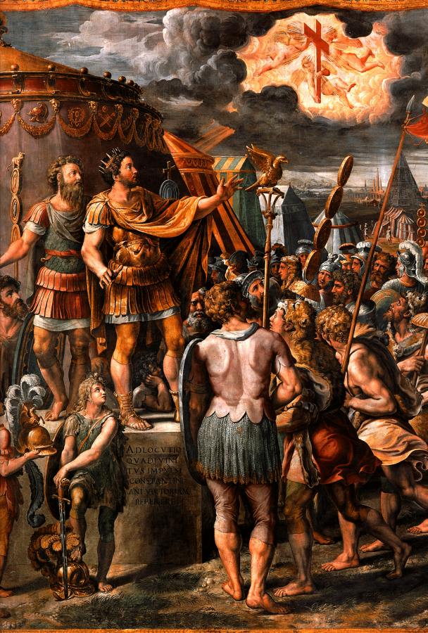 Далее, в книге "Крещение Руси" мы показали, что знаменитое ВИДЕНИЕ КРЕСТА КОНСТАНТИНУ ВЕЛИКОМУ перед битвой с Максенцием тоже связано с огнестрельным оружием. Пушки именовались ранее "христианским древом", поскольку первые орудия были деревянными. Кроме того, это оружие было впервые принято на вооружение сторонниками апостольского христианства и связывалось с именем Христа. Пушки Дмитрия Донского = Константина Великого помогли ему утвердить христианство в качестве государственной религии всей Великой Империи. В этом смысле пушки были "христовым оружием". Поздние авторы символически описывали их как явление в небе огненного Христианского Креста, обеспечившего Дмитрию = Константину великую победу, рис.1.35.