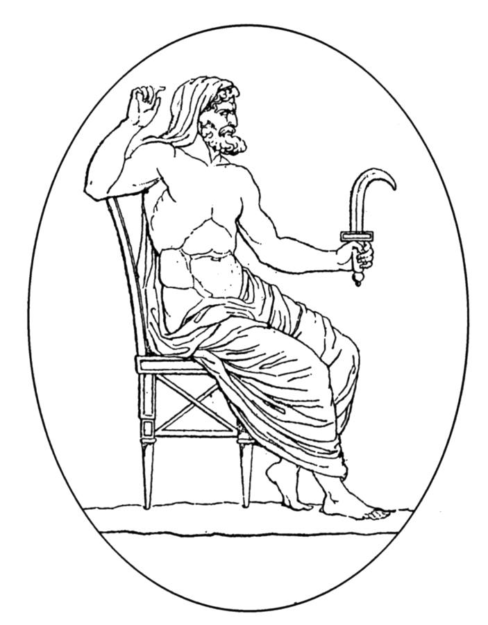 <<После того как Уран низверг своих восставших сыновей киклопов в Тартар - мрачное пространство в подземном мире, находящееся на таком же расстоянии от земли, как земля от неба; если сбросить туда медную наковальню, то она достигла бы его дна за девять дней, - мать-Земля родила ему титанов. В отместку за киклопов мать-Земля убедила титанов напасть на своего отца. Они послушались и, возглавляемые самым младшим из семерки - Кроном, вооруженным серпом из "седого железа", напали на спящего Урана и безжалостный Крон оскопил его своим серпом...